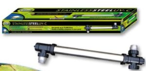 vi anbefaler et uv system for at bekæmpe de grønne svævealger. Uvc systemet virker på den måde at man fører vandet ind i den ene ende og ud af den anden. Inde i røret sidder lyset, som bestråler vandet (se billedet)